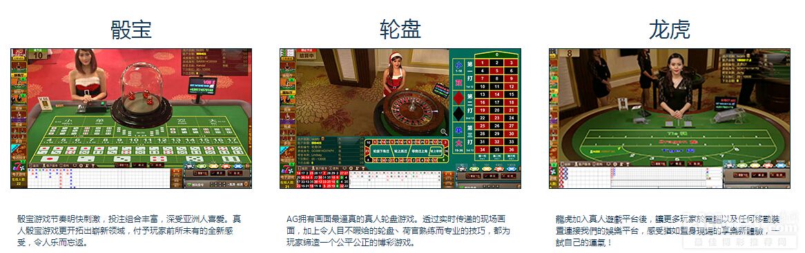 一直以来,AG及团队秉持「只为非同凡享」的态度,发挥无限创意,为玩家带来最高层次的享乐体验。为此,我们一直努力不懈地向前迈进,研发出更多独一无二的游戏新体验,冲破网上娱乐平台的传统束缚,并且引领业界不断向前。 AG与时并进开拓移动装置游戏平台,让玩家无论身处何地,依然随时感受到逼真丶震撼,彷如置身现场的玩乐体验。我们的团队坚持缔造一个「公平丶公正丶公开丶安全」的真人荷官博彩平台,符合并获得了IOM及First Cagayan的牌照,并取得独立的第三方认证机构TST丶GLI认证,是最值得信赖的游戏娱乐集团。 AG亦有提供一站式服务,从网页设计到平台嵌入,乃至技术支援等,全方位满足客户的需要,印证我们专业团队的可靠实力。我们期望与商业夥伴共同将游戏娱乐业务,变成世界共同语言,继而扩展至亚洲以外的世界领域。 AG是所有游戏业务的明智之选! 平台产品 Asia Gaming(AG平台)是一个真人荷官娱乐平台,提供:百家乐(VIP包桌百家乐、极速百家乐、经典百家乐、连环百家乐、免拥百家乐、咪牌百家乐)、龙虎斗、骰宝3种在线博彩游戏。 ![]() ![]() ![]() ![]()